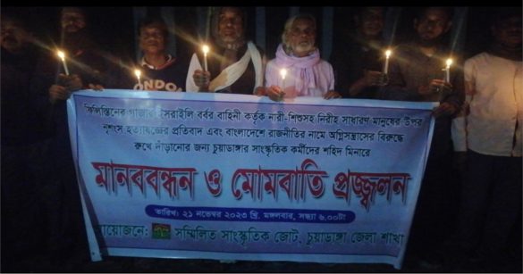 মঙ্গলবার (২১ নভেম্বর) রাত সাড়ে ৭টায় সাংস্কৃতিক জোট চুয়াডাঙ্গা জেলা শাখার আয়োজনে চুয়াডাঙ্গা সরকারি কলেজের শহীদ মিনার চত্বরে এই মানববন্ধন ও মোমবাতি প্রজ্জলন করা হয়।