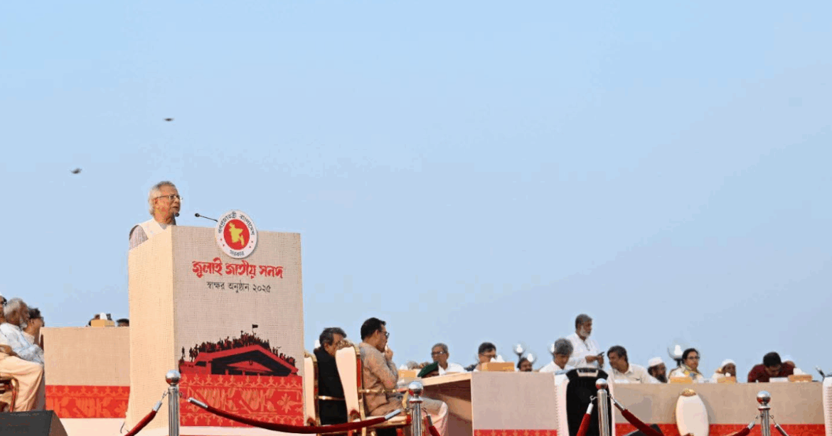 প্রধান উপদেষ্টা বলেন, ‘জুলাই সনদ স্বাক্ষরের মাধ্যমে নতুন বাংলাদেশের সূচনা হলো। যে তরুণরা এই দিনটিকে সম্ভব করেছে, এই পরিবর্তনের জন্য যারা জীবন দিয়েছে, তারাই বাংলাদেশকে গড়বে।’