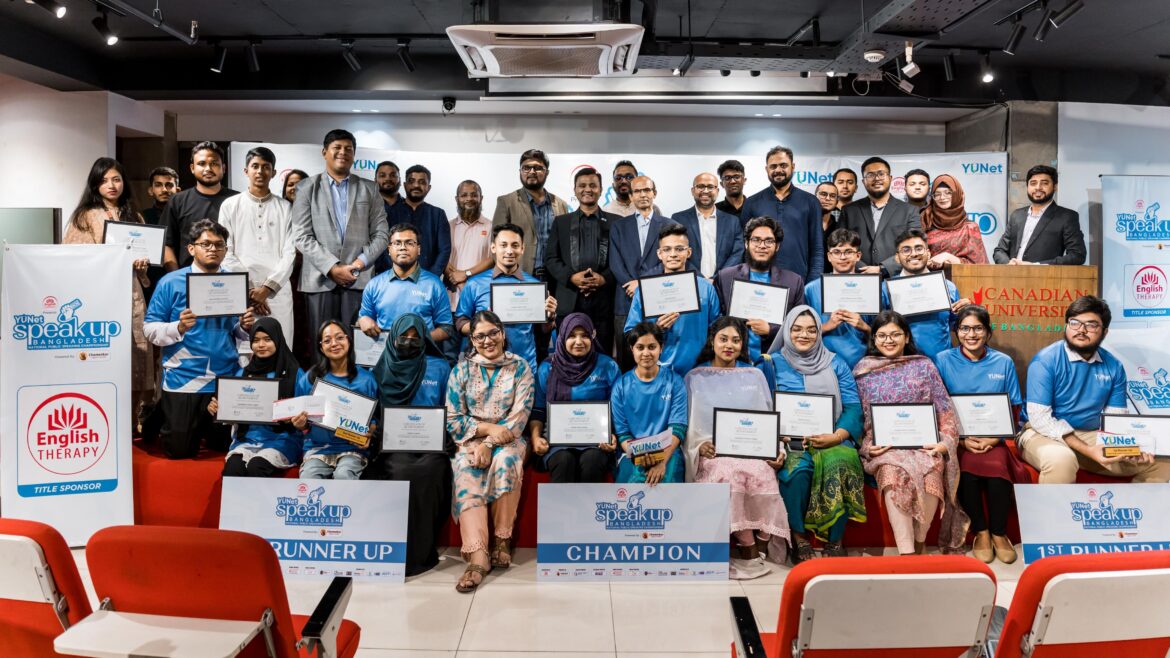 তরুণদের কথার শক্তি, আত্মবিশ্বাস এবং নেতৃত্বের বার্তা ছড়িয়ে দিয়ে সফলভাবে শেষ হলো ইউনেট স্পিকআপ বাংলাদেশ ২০২৫—যা হয়ে থাকবে বহু তরুণের জীবনের প্রেরণার মাইলফলক। আয়োজনটির স্পন্সর হিসেবে যুক্ত ছিলো ইংলিশ থেরাপি, চমৎকার ডিজিটাল, গ্লোবাল ট্রাভেলস, ব্যাস নেটওয়ার্ক এবং কানাডিয়ান ইউনিভার্সিটি অব বাংলাদেশ।