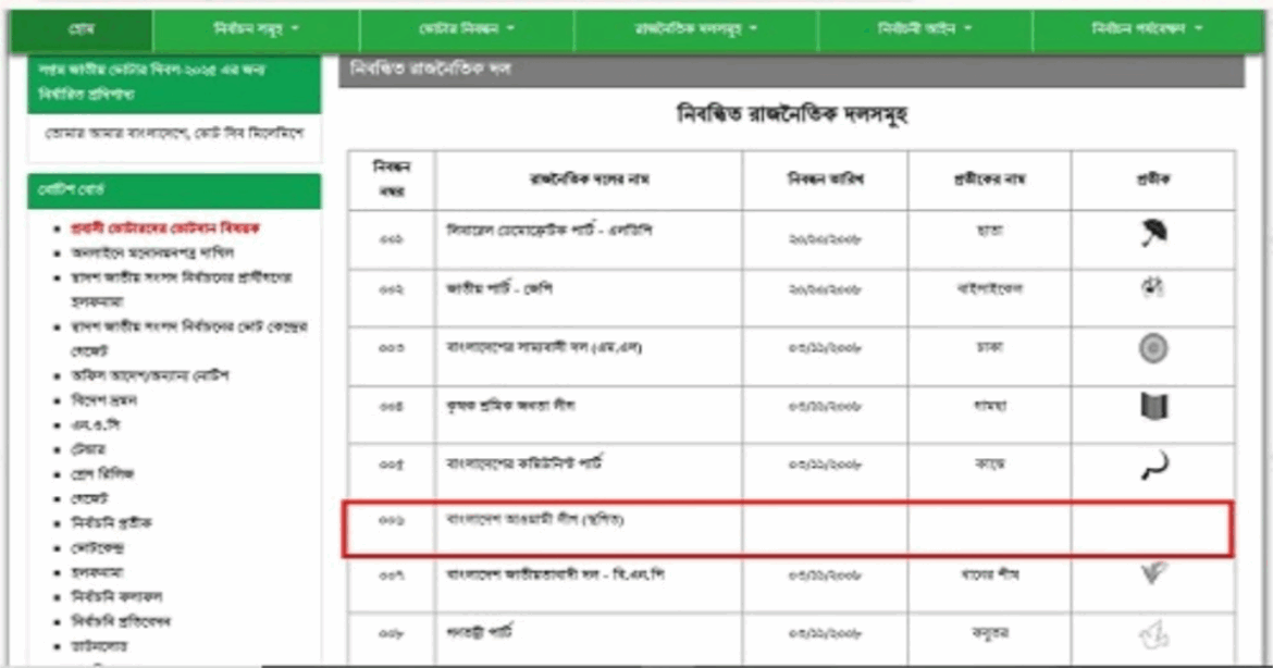বাংলাদেশ নির্বাচন কমিশন (ইসি) ওয়েবসাইট থেকে বাংলাদেশ আওয়ামী লীগ (নিবন্ধন স্থগিত) জন্য বরাদ্দকৃত ‘নৌকা’ প্রতীক সরিয়ে ফেলা হয়েছে।