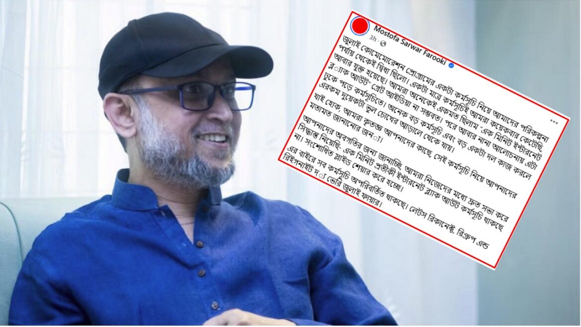 পোস্টে মোস্তফা সরয়ার ফারুকী লেখেন, জুলাই কোমেমোরেশন প্রোগ্রামের একটি কর্মসূচি নিয়ে আমাদের শুরু থেকেই কিছুটা দ্বিধা ছিল। একটি মাত্র কর্মসূচি আমরা একাধিকবার বাদ দিয়েছি, আবার যুক্ত করেছি। আমাদের অনেকেই মনে করছিলেন, ‘এক মিনিট ইন্টারনেট ব্ল্যাকআউট’ সম্ভবত তেমন একটা ভালো আইডিয়া নয়।