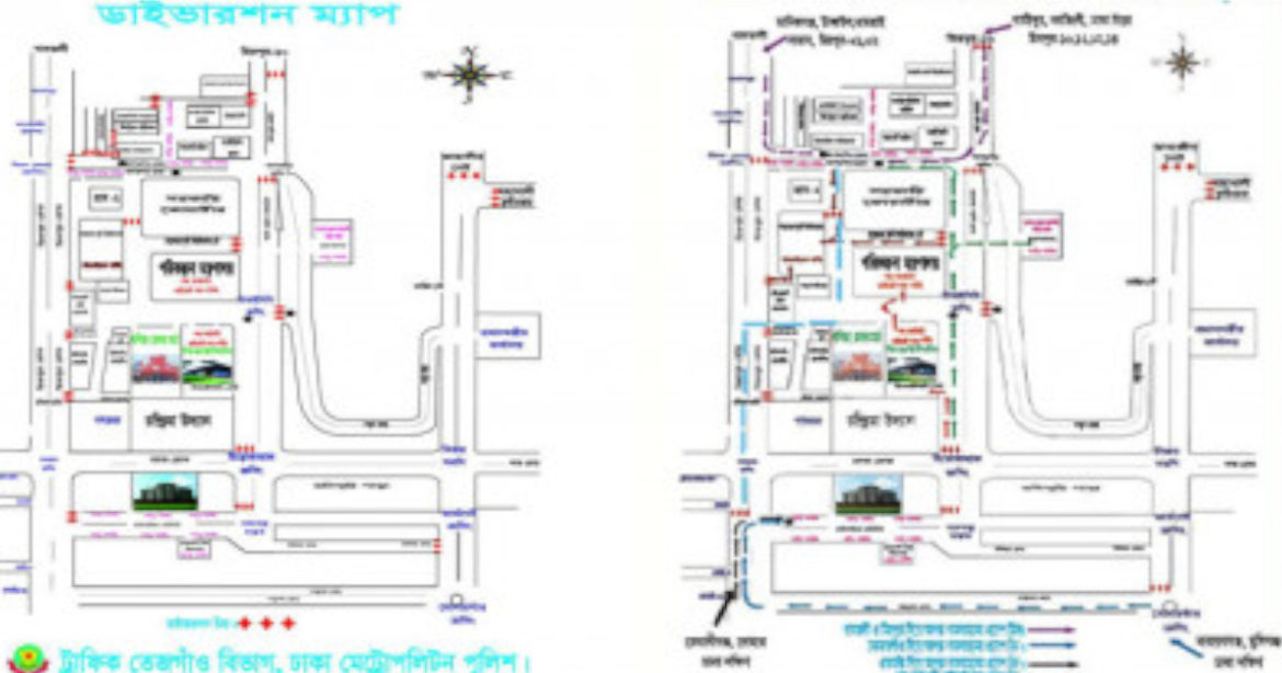 এক সংবাদ বিজ্ঞপ্তিতে বেলা ১১টা থেকে সন্ধ্যা ৬টা পর্যন্ত এসব সড়ক এড়িয়ে বিকল্প সড়ক ব্যবহারের জন্য পরামর্শ দেয়া হয়। যান চলাচলের জন্য নিয়ন্ত্রণে থাকা সড়কগুলো হলো, শ্যামলী, শিশু মেলা ক্রসিং এবং ৬০ ফিট থেকে আগারগাঁও লাইট ক্রসিং হয়ে রোকেয়া সরণি পর্যন্ত, লাভরোড পূর্ব মাথা, বিজয় সরণি ক্রসিং এবং ক্রিসেন্ট লেক হয়ে গণভবন ক্রসিং পর্যন্ত। এ ছাড়া আরও কিছু সড়কে যান চলাচল সীমিত করা হয়েছে।
