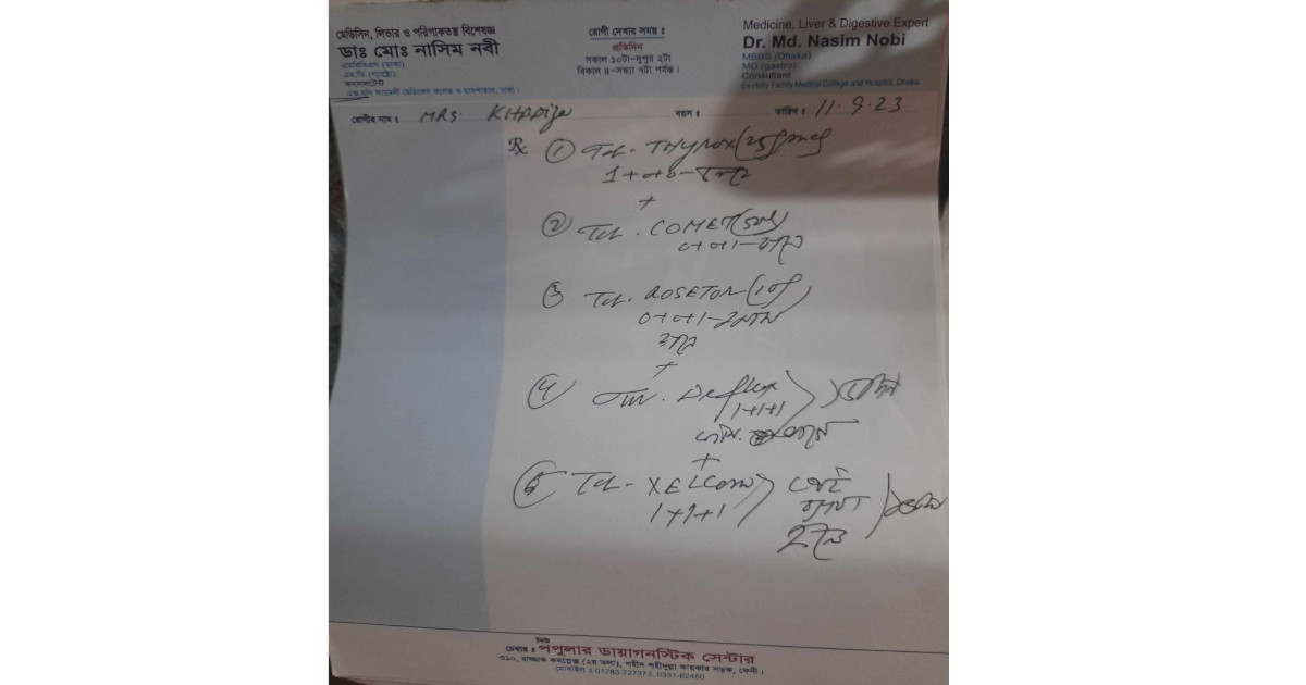 ফেনী জেলা প্রাইভেট হাসপাতাল এন্ড ডায়াগনস্টিক সেন্টার ওনার্স এসোসিয়েশনের সিদ্ধান্ত উপেক্ষা করে চেম্বারে বসে রোগীর ব্যবস্থাপত্রে বিভিন্ন কোম্পানীর ঔষধ লিখে তা আবার বিক্রয় প্রতিনিধিদের ডেকে সেই ব্যবস্থাপত্রের ছবি তুলে দেন ডা. মো. নাসিম নবী।
