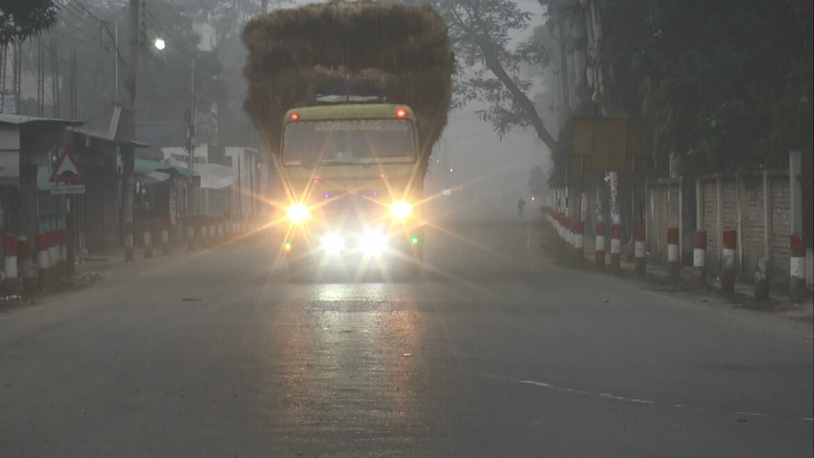 কুয়াশার চাদরে মোড়া লালমনিরহাট, হেডলাইটের আলোতে চলছে যানবাহন