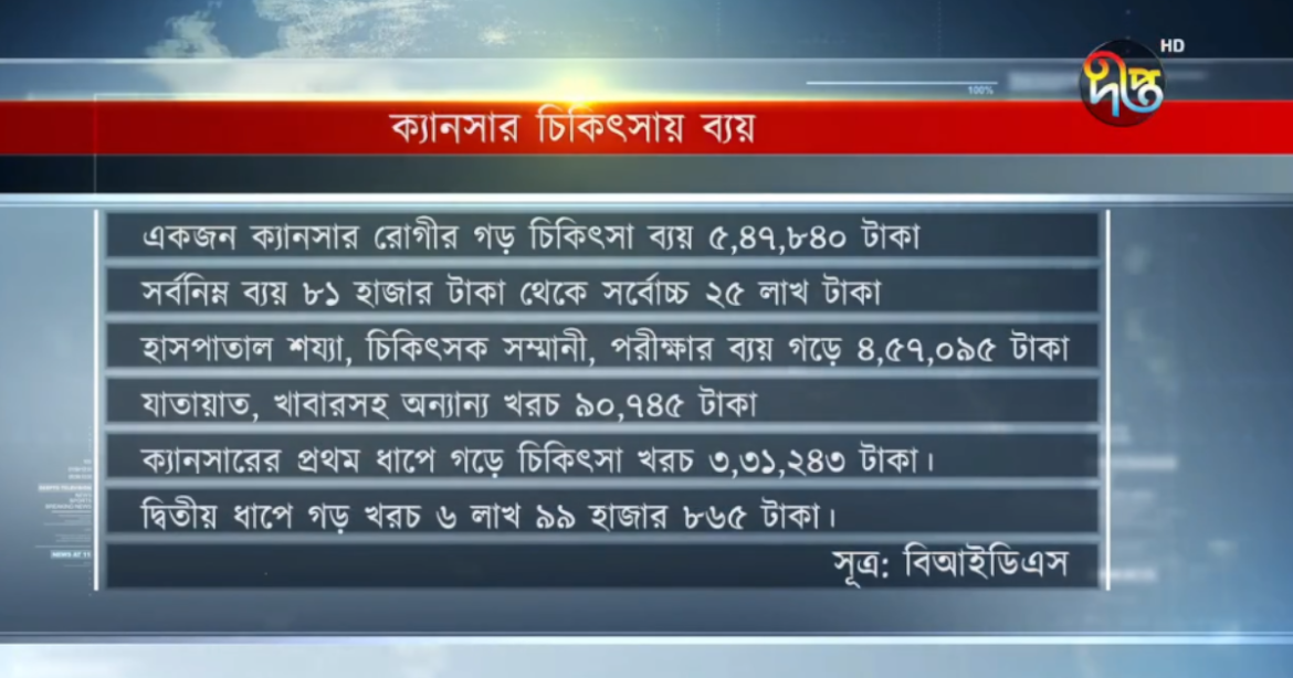 ২০২৩ সালে বাংলাদেশ উন্নয়ন গবেষণা প্রতিষ্ঠান বিআইডিএসের এক গবেষণায় উঠে এসেছে, একজন ক্যান্সার রোগীর চিকিৎসায় প্রথম পর্যায়ে গড়ে তিন লাখ ৩০ হাজার টাকা খরচ হয়। দ্বিতীয় স্তরে প্রয়োজন হয় সাত লাখ টাকা। শেষ পর্যন্ত এই খরচ আরও বেড়ে যায়।