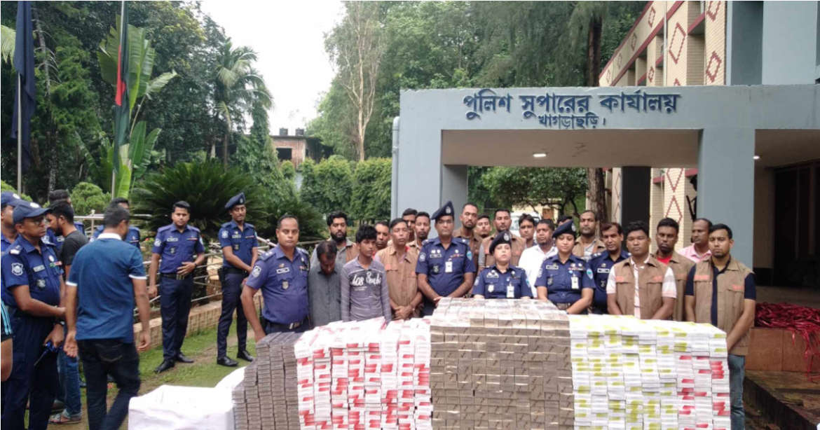 খাগড়াছড়ি পুলিশ সুপার মুক্তা ধর বিকালে প্রেস ব্রিফিং করে সাংবাদিকদের জানান, গোপন সংবাদের ভিত্তিতে বুধবার দুপুর ১২.৪৫ ঘটিকার জেলা গোয়েন্দা শাখার অফিসার ইনচার্জ মোহাম্মদ সামসুজ্জামানের নেতৃত্বে এস আই আশিকুর রহমান, এসআই উক্যমং রাখাইন, এসআই নিক্সন চৌধুরী ফোর্সসহ পূর্ব শান্তিপুরস্থ সাধন মাষ্টারের ভাড়া ঘরে অভিযান পরিচালনা করে ২ জনকে আটকসহ অবৈধ আমদানি নিষিদ্ধ সর্বমোট ১৪টি কার্টুন বিদেশি সিগারেট জব্দ করে।