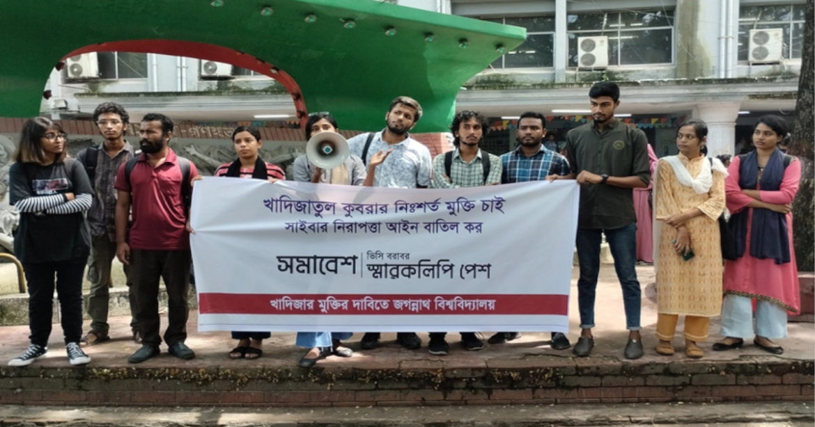 মানববন্ধনে শিক্ষার্থীরা বলেন, খাদিজাতুল কুবরাকে বিনা বিচারে এক বছরের বেশি সময় ধরে আটক রাখা হয়েছে। খাদিজার মুক্তির দাবিতে চলমান আন্দোলনে বিশ্ববিদ্যালয় প্রশাসন বাধা দিয়ে তাদের ন্যাক্কারজনক আচরণ প্রদর্শন করেছে। তার মুক্তির দাবিতে গণস্বাক্ষর কর্মসূচিতে শিক্ষার্থীদের স্বতঃস্ফূর্ত অংশগ্রহণ প্রমাণ করে, খাদিজার প্রতি জুলুম করা হচ্ছে। খাদিজাকে মুক্তি দিতে হবে এবং সাইবার নিরাপত্তা আইন বাতিল করতে হবে। এ বিশ্ববিদ্যালয়ের কোনো শিক্ষার্থীকে যাতে খাদিজার মতো জুলুমের শিকার হতে না হয়, এ ব্যাপারে সবাইকে সজাগ থাকতে হবে।