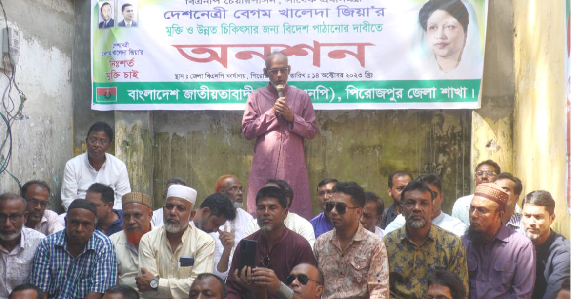 বিএনপির চেয়ারপারর্সন ও সাবেক প্রধানমন্ত্রী বেগম খালেদা জিয়ার মুক্তি ও উন্নত চিকিৎসার জন্য বিদেশ পাঠানোর দাবিতে এ অনশন চলছে । অনশন চলবে দুপুর ১টা পর্যন্ত । বাংলাদেশ জাতীয়তাবাদী দল (বিএনপি) পিরোজপুর জেলা শাখার আয়োজনে অনুষ্ঠানে বক্তব্য রাখেন জেলা বিএনপির সাবেক সভাপতি গাজী নুরুজ্জামান বাবুল, সদস্য সচিব অহিদুজ্জামান লাভলু, আহবায়ক আলমগীর হোসেন ।