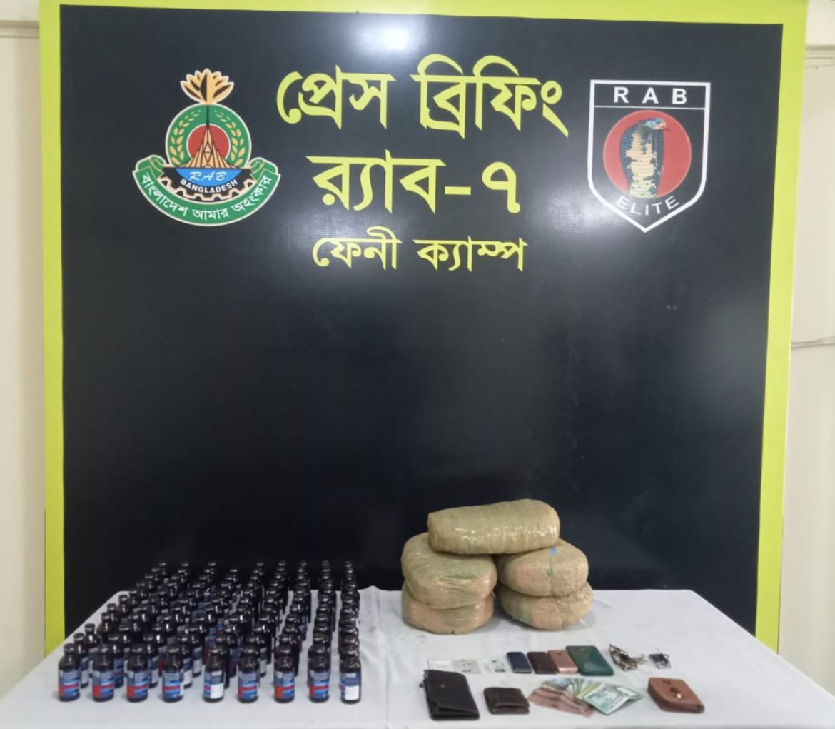 র‌্যাব জানায়, গোপন সংবাদের ভিত্তিতে মঙ্গলবার দুপুরের পর ফেনী সদর হাসপাতাল মোড় সংলগ্ন স্থানে সন্দেহভাজন পরিবহন তল্লাশী চালায় ফেনীস্থ র‌্যাব-৭ এর সদস্যরা। এসময় ছাগলনাইয়া থেকে ফেনীমুখী একটি সিএনজিচালিত অটোরিক্সা থেকে ৯৮ বোতল ফেনসিডিল ও ১০ কেজি গাঁজা উদ্ধার করা হয়েছে। মাদক কারবারের সাথে জড়িত সন্দেহে ১ নারীসহ ৪ জনকে আটক করা হয়। একই সাথে সিএনজি চালিত অটোরিক্সা জব্দ করা হয়।