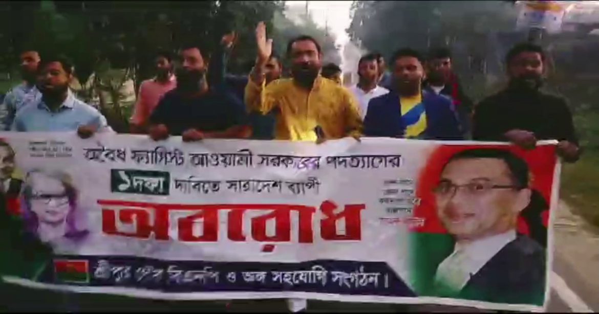 এসময় সরকার হটিয়ে দেয়ার এক দফা দাবি করে স্লোগান দেন নেতাকর্মীরা। গণতন্ত্রের ঘাতক, দুর্নীতিবাজ ফ্যাসিস্ট আওয়ামী সরকারের পদত্যাগ এবং নির্বাচনকালীন নিরপেক্ষ সরকারের দাবীতে ও বিএনপির ডাকা আগামী ৪৮ ঘন্টা অবরোধ সফল করার লক্ষে তাদের এই মিছিল বলে জানানো হয়।