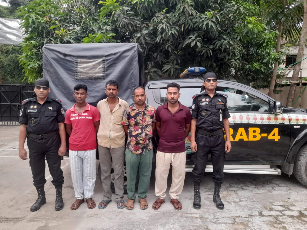 আটককৃতরা হলেনঢাকা জেলার ধামরাই উপজেলার উত্তর হাতকোড়া এলাকার মৃত ইন্তাজ আলীর ছেলে তোফাজ্জল হোসেন (৪৫), নান্দেশরী এলাকার আব্দুর রহিমের ছেলে নূর মোহাম্মদ (৩২), চাইরপাড়া (আদর্শগ্রাম) এলাকার মৃত হাসান আলীর ছেলে শহীদুল্লাহ (৪৫) ও নান্দেশরী এলাকার আব্দুল লতিফের ছেলে আনোয়ার হোসেন (৩২)