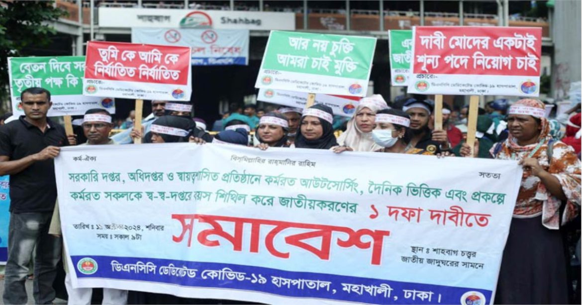 চাকরি জাতীয়করণের দাবিতে রাজধানীর শাহবাগ মোড় অবরোধ করে রেখেছেন বিভিন্ন সরকারি প্রতিষ্ঠানের আউটসোর্সিং কর্মীরা।