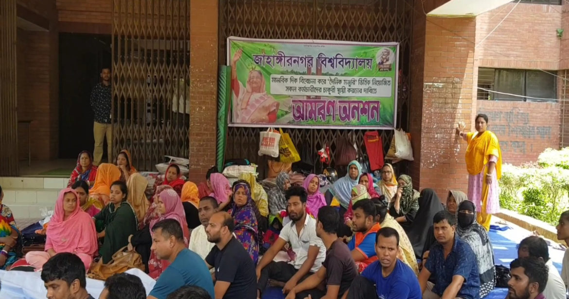 সর্বশেষ চলতি বছরের ২ জানুয়ারি চাকরি স্থায়ীকরণের দাবিতে অনশনে বসেন কর্মচারীরা। তখন ছয় মাসের মধ্যে অগ্রাধিকার ভিত্তিতে বিভিন্ন হল, বিভাগ ও অফিসগুলোতে নিয়োগের মৌখিক আশ্বাস দেন প্রশাসন। তবে ছয় মাস অতিবাহিত হলেও তার কোনো বাস্তবায়ন না হওয়ায় আবারও অবস্থান ধর্মঘটে বসেন তারা। কিন্তু অবস্থান ধর্মঘটের পরেও প্রশাসন দাবি না মেনে নেয়ায় বাধ্য হয়ে তারা আমরন অনশনে বসেছেন।