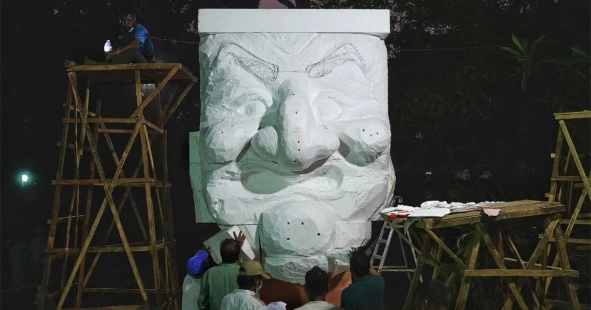 দেখা যায়, পুরোদমে প্রতিকৃতিটি তৈরির কাজ চলছে। রাতারাতি কাজ শেষ করতে আপাতত কর্কশিট দিয়েই কাজ চালাচ্ছেন শিল্পীরা।