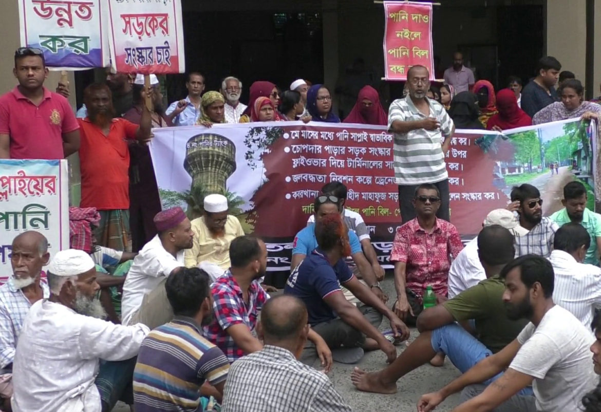 বিক্ষোভকালে ক্ষুব্ধ এলাকাবাসী জানান, পৌরসভা বিল নিলেও নিয়মিত পানি সরবরাহ করছে না। গত মার্চ ২৩ থেকে ৭ নম্বর ওয়ার্ডে পানি সরবরাহ বন্ধ হয়ে গেছে। পাশাপাশি চোপদারপাড়া সড়ক, জমাদারপাড়া সড়ক, কবরখানা সড়ক, শহীদ মাহফুজ সড়কসহ সকল বাইলেনসমূহ চলাচলের অনুপযোগী হয়ে পড়েছে।