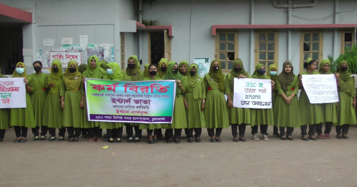 এসময় চুয়াডাঙ্গা সদর হাসপাতালের প্রায় অর্ধশতাধিক ইন্টার্ন নার্স কর্মবিরতিতে অংশ গ্রহন করেন।