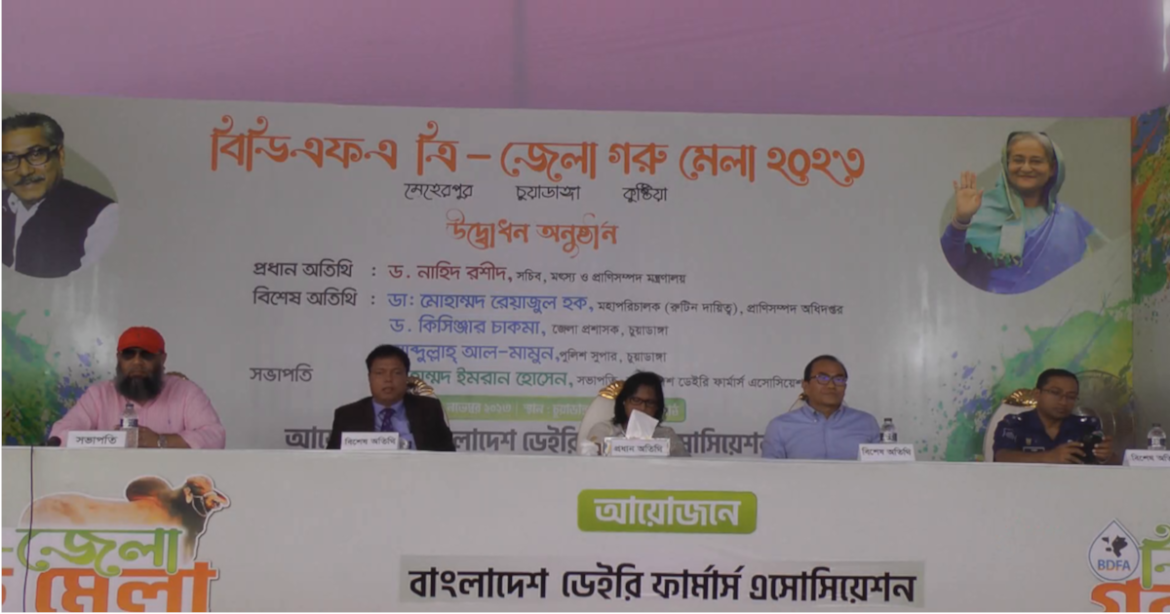 বাংলাদেশ ডেইরি ফার্ম এসোসিয়েশনের সভাপতি মোহাম্মদ ইমরানের সভাপতিত্বে প্রধান অতিথি হিসেবে উপস্থিত ছিলেন মৎস্য ও প্রাণিসম্পদ মন্ত্রণালয়ের সচিব ড. নাহিদ রশিদ। বিশেষ অতিথি হিসাবে ছিলেন প্রাণিসম্পদ অধিদপ্তরের মহাপরিচালক ডা: মোহাম্মদ রেয়াজুল হক, চুয়াডাঙ্গা জেলা প্রশাসক ড. কিসিঞ্জার চাকমা ও পুলিশ সুপার আব্দুল্লাহ্ আল মামুন।