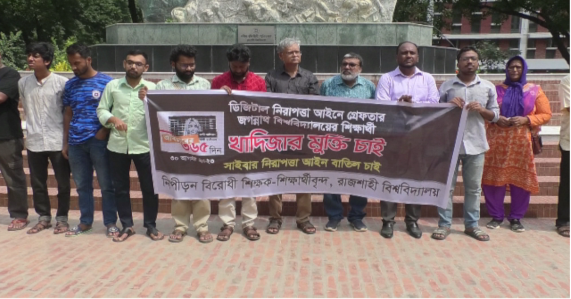 ডিজিটাল নিরাপত্তা আইনে গ্রেফতার জগন্নাথ বিশ্ববিদ্যালয়ের রাষ্ট্রবিজ্ঞান বিভাগের শিক্ষার্থী খাদিজাতুল কুবরার বিনা বিচারে কারাবন্দীর এক বছর অতিবাহিত হওয়ার প্রতিবাদে রাজশাহী বিশ্ববিদ্যালয়ে মানববন্ধন অনুষ্ঠিত হয়েছে।