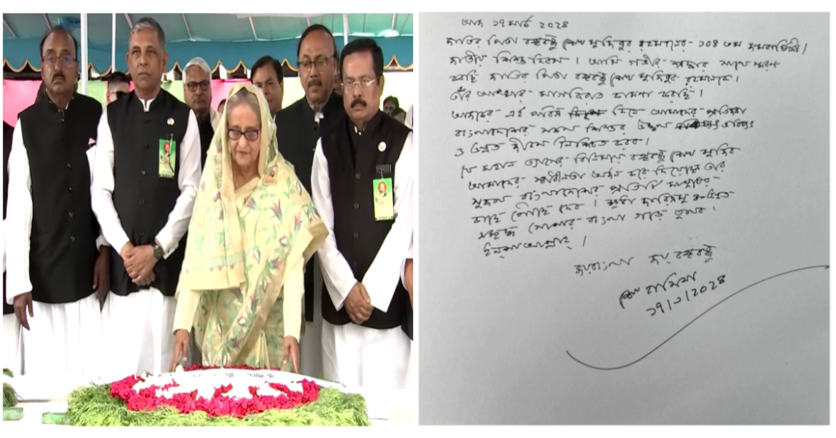 শেখ হাসিনা আরও লিখেন, ‘যে মহান ত্যাগের বিনিময়ে বঙ্গবন্ধু শেখ মুজিব আমাদের স্বাধীনতা অর্জন করে দিয়েছেন, তার সুফল বাংলাদেশের প্রতিটি মানুষের কাছে পৌঁছে দেব। ক্ষুধা ও দারিদ্র্যমুক্ত উন্নত সমৃদ্ধ সোনার বাংলা গড়ে তুলব। ইনশাআল্লাহ।‘ “জয় বাংলা জয় বঙ্গবন্ধু“