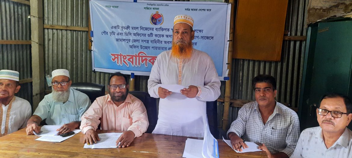 জামালপুরে একটি কুচক্রী মহল ব্যক্তিগত স্বার্থ আদায়ের লক্ষ্যে পৌর ভুমি এবং ডিসি অফিসের গুটি কয়েক কর্মচারীর যোগসাজোসে জেলা সশস্ত্র বাহিনী অবসরপ্রাপ্ত সদস্যদের অফিস উচ্ছেদের পায়তারা করার প্রতিবাদে সাংবাদিক সম্মেলন অনুষ্ঠিত হয়েছে।
