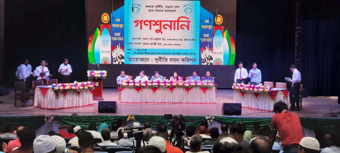 জামালপুর সদর উপজেলার সরকারি দপ্তরের সেবা প্রাপ্তি নিশ্চিতকরণ ও সরকারি কর্মকর্তাদের মধ্যে সততা ও মূল্যবোধের মান বজায় রাখতে এই গণশুনানি অনুষ্ঠিত হয়। জেলা প্রশাসক শ্রাবস্তী রায়ের সভাপতিত্বে প্রধান অতিথি হিসেবে উপস্থিত ছিলেন দুর্নীতি দমন কমিশনের কমিশনার (তদন্ত) মোঃ জহুরুল হক।
