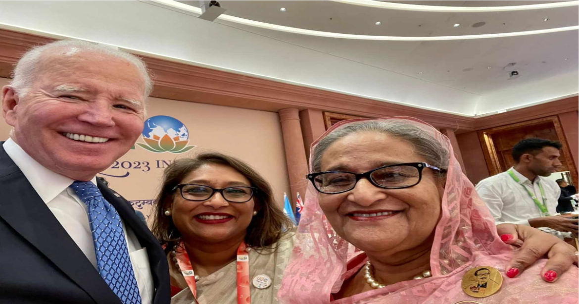 ভারতের নয়াদিল্লিতে জি–২০ সম্মেলন উদ্বোধনের পর একফাঁকে মার্কিন প্রেসিডেন্ট জো বাইডেনের সাথে প্রধানমন্ত্রী শেখ হাসিনার অনানুষ্ঠানিক আলাপ হয়েছে। এ সময় বাংলাদেশের সরকার প্রধানের সাথে ছিলেন তার কন্যা সায়মা ওয়াজেদ পুতুল ও পররাষ্ট্রমন্ত্রী ড. এ কে আব্দুল মোমেন। তখন হাস্যোজ্জ্বল অবস্থায় সেলফি তোলেন জো বাইডেন।