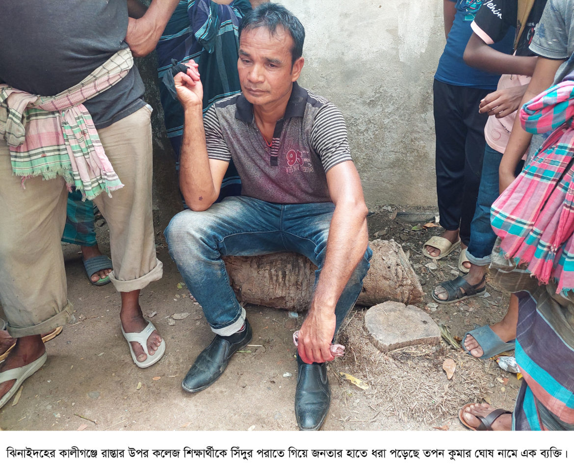 ঝিনাইদহের কালীগঞ্জ শহরের ফয়লা এলাকায় এক কলেজ শিক্ষার্থীকে কপালে সিঁদুর দিতে গিয়ে স্থানীয়দের কাছে হাতেনাতে ধরা পড়েছে তপন কুমার ঘোষ নামে ৫০ বছর বয়সী এক ব্যক্তি।