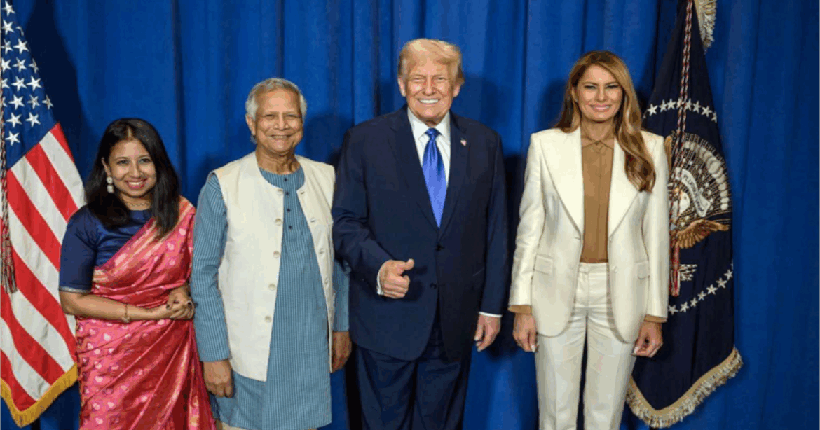 মার্কিন প্রেসিডেন্ট ডোনাল্ড ট্রাম্প ও ফার্স্ট লেডি মেলানিয়া ট্রাম্পের সঙ্গে বাংলাদেশের প্রধান উপদেষ্টা অধ্যাপক ড. মুহাম্মদ ইউনূস ও তার মেয়ে দিনা ইউনূসের একটি ছবি প্রকাশ করেছে প্রেস উইং।