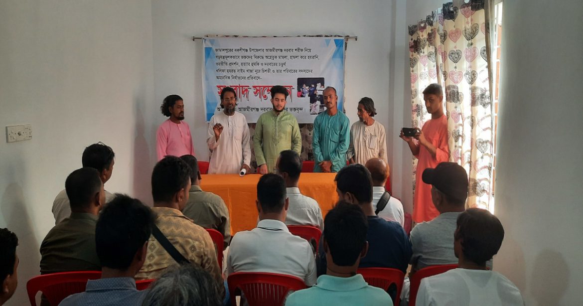 জামালপুরে আজমীরগঞ্জ দরবার শরীফের ভক্তদের মারধর করে আহত ও মামলা দিয়ে হয়রানির প্রতিবাদে সংবাদ সম্মেলন অনুষ্ঠিত হয়েছে।
