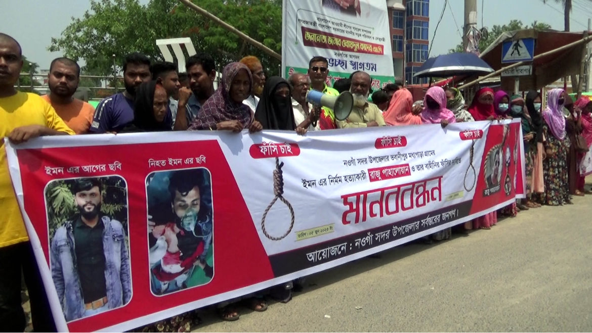 নওগাঁ সদর উপজেলার ভবানীপুর মধ্যপাড়া গ্রামের ইমনকে নৃশংস ভাবে হত্যাকারী টপটেরর রাজু পাহালোয়ান ও তার বাহিনীর ফাঁসির দাবিতে মানববন্ধন অনুষ্ঠিত হয়েছে। প্রচন্ড তাপদাহকে উপেক্ষা করে সোমবার (৫ জুন) শহরের মুক্তির মোড়ে এই মানববন্ধন অনুষ্ঠিত হয়। সদর উপজেলার সর্বস্তরর জনগণের পক্ষ থেকে এই মানববন্ধনের আয়োজন করা হয়।