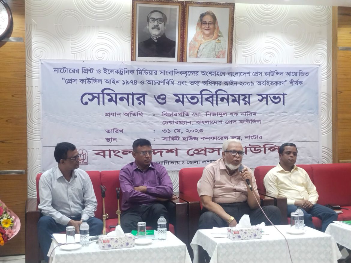 জেলা প্রশাসক আবু নাছের ভূঁঞার সভাপতিত্বে সেমিনারে মূল প্রবন্ধ উপস্থাপন করেন বাংলাদেশ প্রেস কাউন্সিলের সচিব মোঃ মাসুদ খান। মতবিনিময় সভায় বক্তব্য রাখেন অতিরিক্ত জেলা প্রশাসক (সার্বিক) মোঃ মাছুদুর রহমান, জেলা তথ্য অফিসার মোহাম্মদ আলী, নাটোর সদর থানার ভারপ্রাপ্ত কর্মকর্তা নাছিম আহম্মেদ ।