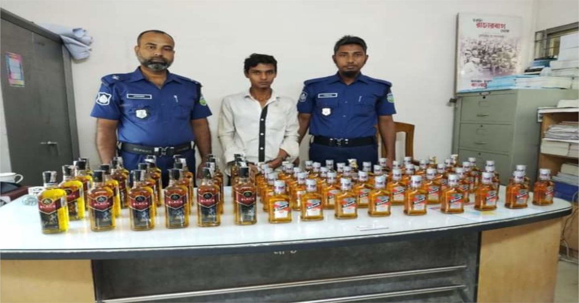এ সময় তার কাছ থেকে ৪৫ বোতল Mc Dowell’s 180ml ও ২৪ বোতল AC BLACK 375ml ভারতীয় মদ উদ্ধার করে পুলিশ।
