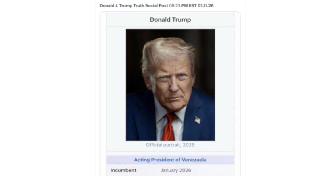 রবিবার ট্রুথ সোশ্যালে নিজের একটি ছবি পোস্ট করেছেন প্রেসিডেন্ট ট্রাম্প। পোস্টে তিনি লিখেছেন— ‘Acting President of Venezuela, Incumbent January 2026’ ( ভারপ্রাপ্ত প্রেসিডেন্ট ভেনেজুয়েলা, ২০২৬ সালের জানুয়ারি থেকে দায়িত্বে)।
