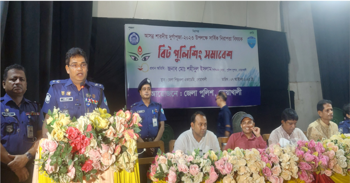 আসন্ন শারদীয় দুর্গা পূজা উপলক্ষ্যে নোয়াখালী জেলা পুলিশের উদ্যোগে শারদীয় দূর্গা পূজার নিরাপত্তা বিষয়ক বিট পুলিশিং সমাবেশ ও মতবিনিময় সভা অনুষ্ঠিত হয়েছে।