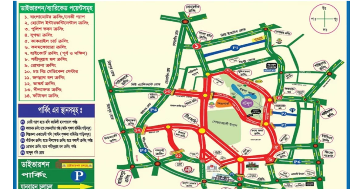 মঙ্গলবার (১৪ এপ্রিল) রমনা বটমূল, সোহরাওয়ার্দী উদ্যান ও ঢাকা বিশ্ববিদ্যালয় এলাকা কেন্দ্র করে ১৪টি পয়েন্টে ডাইভারশন বা যান চলাচলের পথ পরিবর্তন করা হয়।