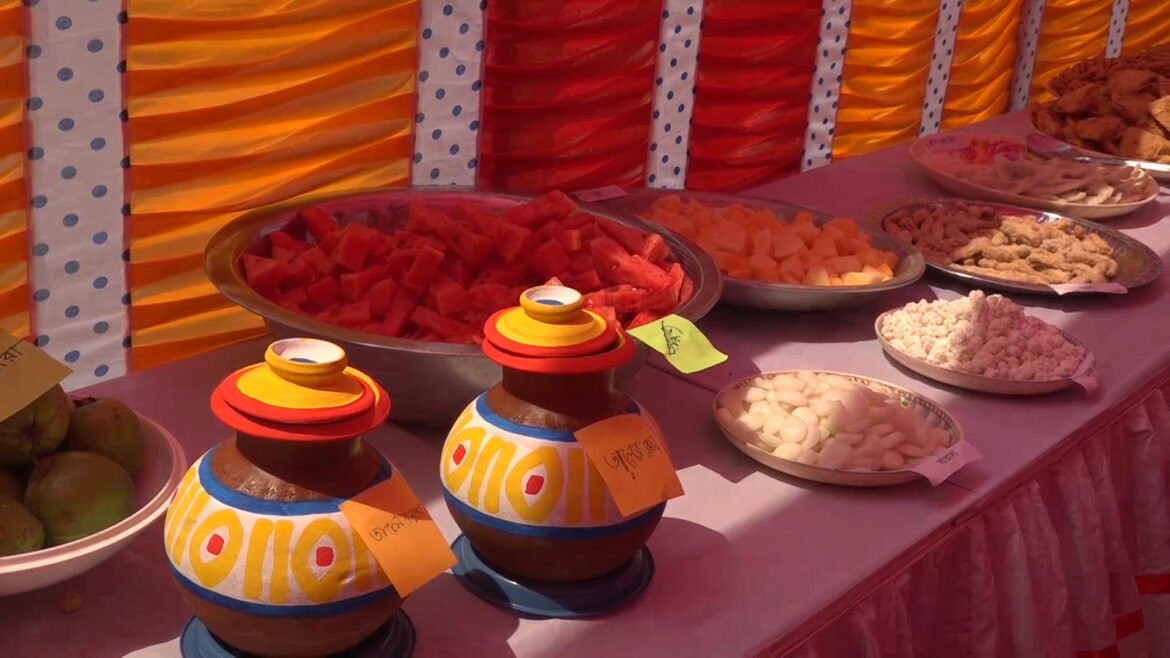 সরেজমিনে দেখা যায়, পিরোজপুরের গোপালকৃষ্ণ টাউন ক্লাব মাঠ প্রাঙ্গণ ছিল উৎসবের রঙে রাঙানো। দুধকুলি, ক্ষীরকুলি, তিলকুলি, পাটিসাপটা, ফুলঝুড়ি, ধুপি পিঠা, নকশি পিঠা, মালাই পিঠা, মালপোয়া, পাকন পিঠা, ঝাল পিঠাসহ ২৫ ধরনের পিঠা, কয়েক জাতের কলা, আনারস, পেপে, পেচি গাব, ডুমুর ফল, কাঠাল, চালতা, আতা, সফেদা, বেতফল, টকফলসহ ৪৫ ধরনের ফল, চমচম, রসগোল্লা, রসমালাই, কালজামসহ ২০ ধরনের মিষ্টান্ন, বেলের রস, তালের রস, খেজুরের রস সহ ১১ ধরনের শরবতের পসেরা সাজিয়ে বসেছে আয়োজকরা। অতিথিরা হাতে মাটির বাসন নিয়ে তাদের পছন্দ সই খাবার বেছে নিচ্ছেন এবং নির্দিষ্ট আসনে বসে এসব ফল পিঠা মিষ্টান্ন খাচ্ছেন।