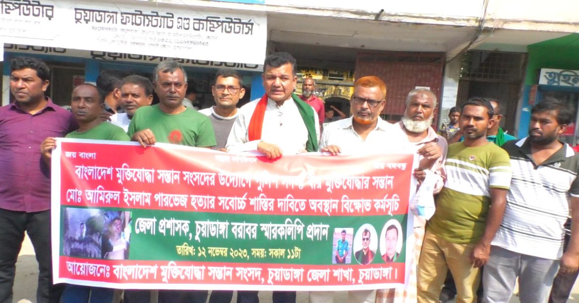 গত ২৮ অক্টোবর বিএনপির মহাসমাবেশে কর্তব্যরত অবস্থায় পুলিশ সদস্য আমিরুল হককে হত্যার প্রতিবাদ জানিয়ে চুয়াডাঙ্গায় মানববন্ধন কতরেছে বীর মুক্তিযোদ্ধার সন্তানরা।