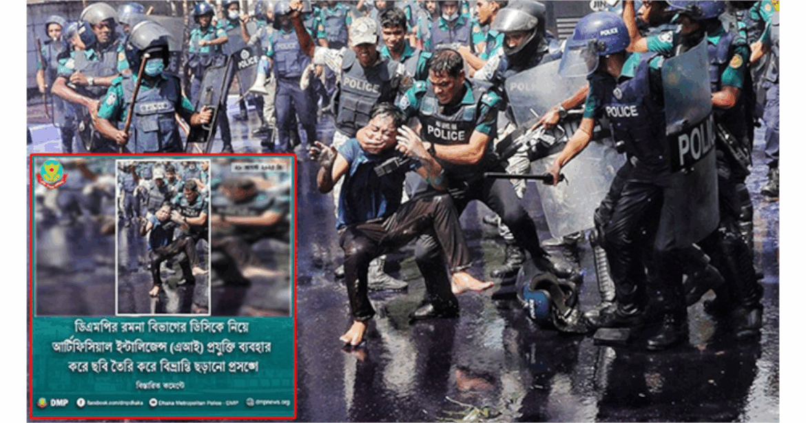 বিজ্ঞপ্তিতে বলা হয়, সম্প্রতি ডিএমপি রমনা বিভাগের উপপুলিশ কমিশনার মো. মাসুদ আলমকে নিয়ে এআই প্রযুক্তি ব্যবহার করে তৈরি এক ছাত্রের মুখ চেপে ধরার একটি ছবি বিভিন্ন গণমাধ্যম ও সামাজিক মাধ্যমে প্রকাশিত হয়েছে। এটি ডিএমপি দৃষ্টিগোচর হয়েছে। কে বা কারা সম্পূর্ণ উদ্দেশ্যমূলকভাবে উক্ত ছবিটি তৈরি করে জনমনে অহেতুক বিভ্রান্তি ছড়ানোর চেষ্টা করেছে। ছবিটি গভীরভাবে পর্যবেক্ষণ করলে বুঝা যায়, তা সম্পূর্ণ এআই প্রযুক্তি ব্যবহার করে তৈরি এবং বাস্তবতা বিবর্জিত।