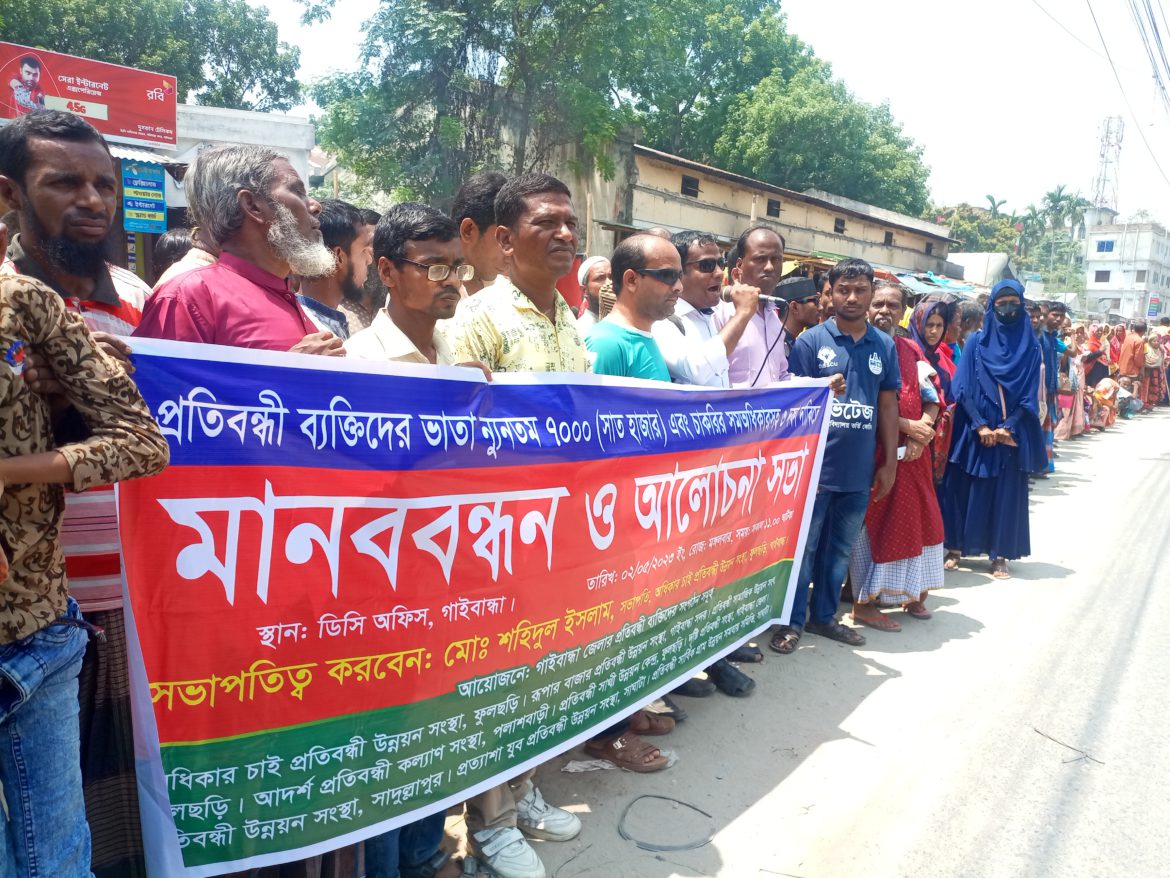 ফুলছড়ি, সাঘাটা, গাইবান্ধা সদর, পলাশবাড়ী ও সাদুল্লাপুর উপজেলার প্রতিবন্ধী শিক্ষার্থী, অভিভাবক, বিভিন্ন পেশাজীবীরা মানববন্ধনে অংশগ্রহণ করে। দাবির সাথে একাত্বতা প্রকাশ করেন গাইবান্ধা সামাজিক সংগ্রাম পরিষদের আহ্বায়ক জাহাঙ্গীর কবির তনু।