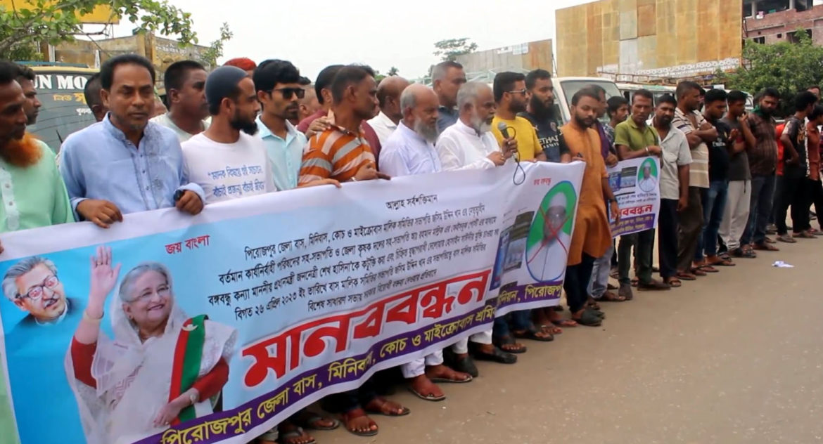 পিরোজপুর জেলা বাস, মিনিবাস, কোচ ও মাইক্রোবাস শ্রমিক ইউনিয়নের আয়োজনে পিরোজপুর কেন্দ্রীয় বাস টার্মিনালের সামনের সড়কে ঘন্টাব্যাপী এ মানববন্ধন অনুষ্ঠিত হয়। শনিবার (১০ জুন) বেলা সাড়ে ১১ টায় ঘন্টাব্যাপী এ মানববন্ধনে বক্তব্য রাখেন জেলা বাস ও মিনিবাস মালিক সমিতির সাবেক সাধারণ সম্পাদক আক্তারুজ্জামান ফুলু, জেলা শ্রমিক লীগের সভাপতি মজনু তালুকদার, জেলা বাস ও মিনিবাস মালিক সমিতির সাবেক সাধারণ সম্পাদক বাবুল হালদার, জেলা শ্রমিক ইউনিয়নের সভাপতি মো: হান্নান শেখ।