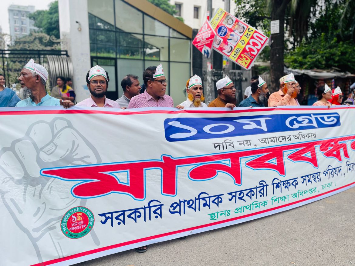 সহকারী শিক্ষকদের বর্তমান বেতন হয় ১৩ তম গ্রেডে। সেটা ১০ম গ্রেডে উন্নীতের দাবিতে বেশ কয়েক মাস ধরে আন্দোলন করে আসছেন সহকারী শিক্ষকরা।