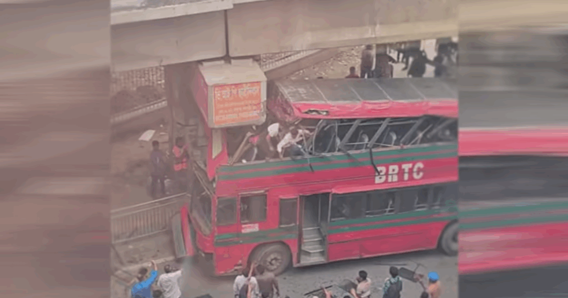 রাজধানী ফার্মগেট এলাকায় এলিভেটেড এক্সপ্রেসওয়ের র‍্যাম্পের নিচে ঢুকে পিলারের সঙ্গে ধাক্কা দিয়েছে বাংলাদেশ সড়ক পরিবহন কর্তৃপক্ষের (বিআরটিসি) দোতলা একটি বাস।