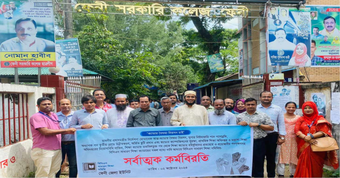 ৬ দফা পূরণের দাবীতে ফেনী সরকারি কলেজ ও সরকারি জিয়া মহিলা কলেজ সহ ৮টি সরকারি কলেজে কর্মবিরতি পালন করছেন বিসিএস সাধারণ শিক্ষা সমিতির সদস্যরা।