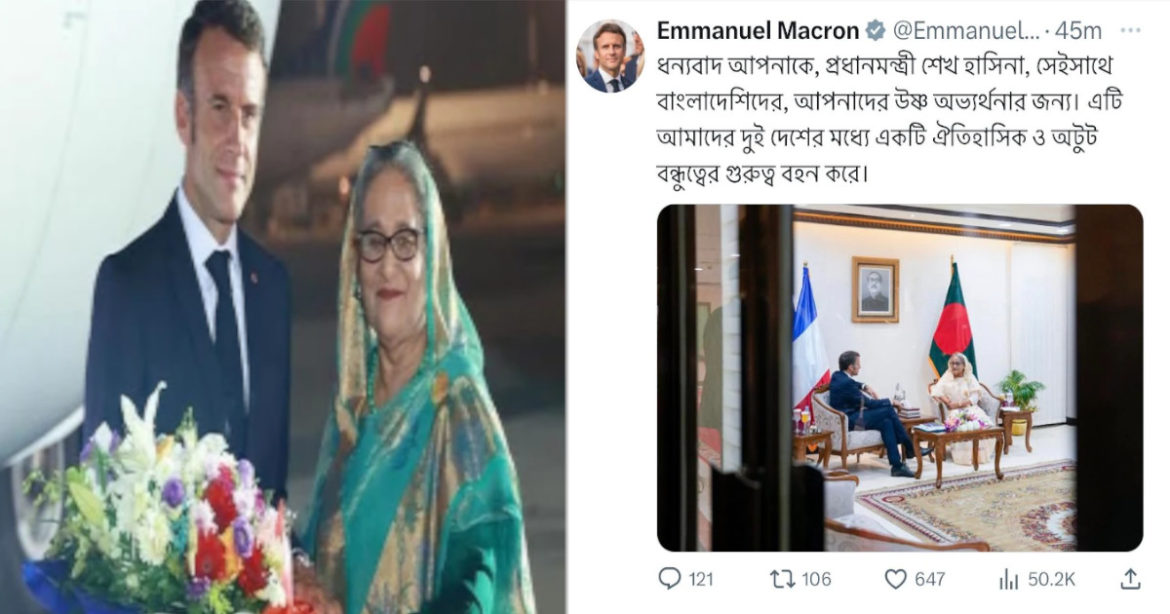 এই টুইটে ম্যাক্রোঁ লিখেছেন, ‘ধন্যবাদ আপনাকে, প্রধানমন্ত্রী শেখ হাসিনা। সেই সঙ্গে বাংলাদেশিদের, আপনাদের উষ্ণ অভ্যর্থনার জন্য। এটি আমাদের দুই দেশের মধ্যে একটি ঐতিহাসিক ও অটুট বন্ধুত্বের গুরুত্ব বহন করে।’
