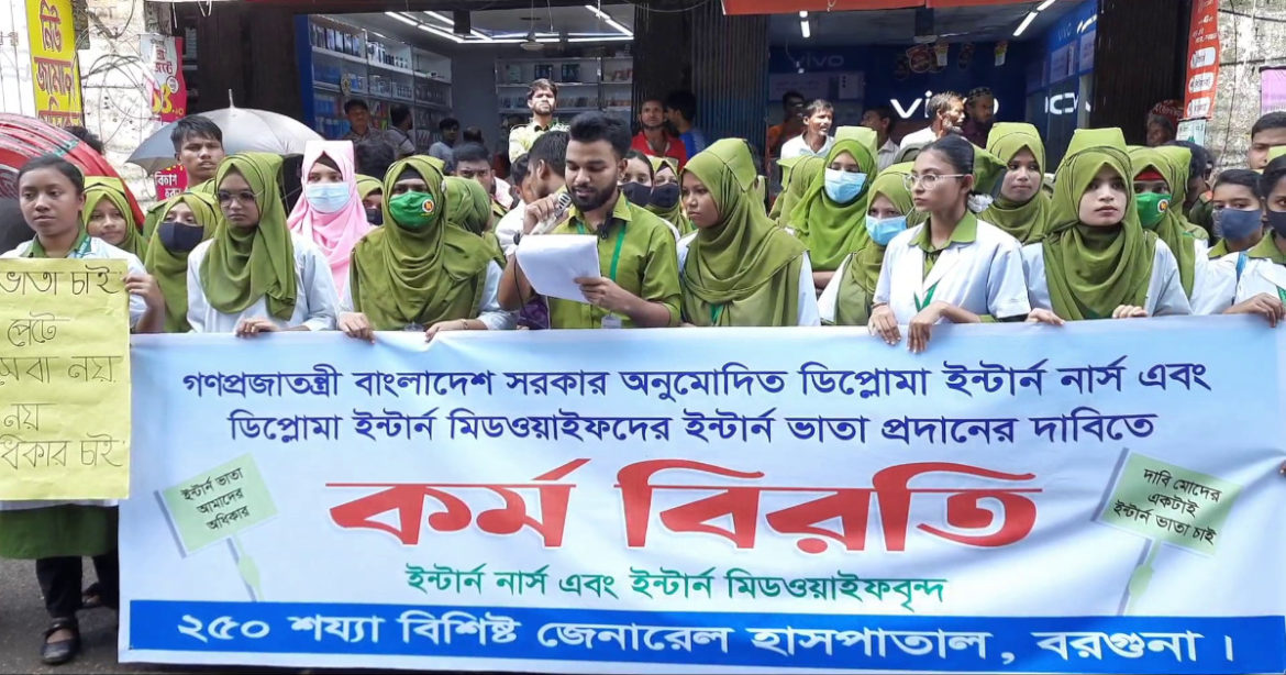 ইন্টার্ন নার্সদের ভাতার দাবীতে বরগুনা মানববন্ধন করেছেন বাংলাদেশ নার্সেস এসোসিয়েশন।