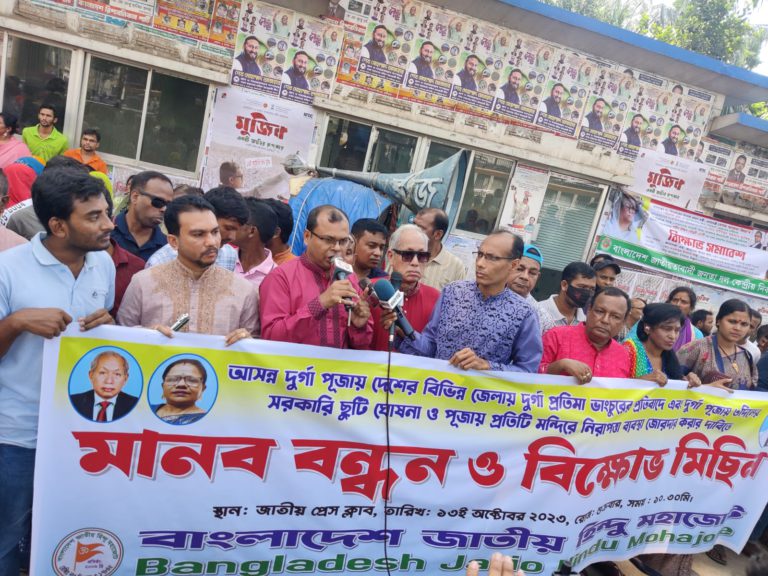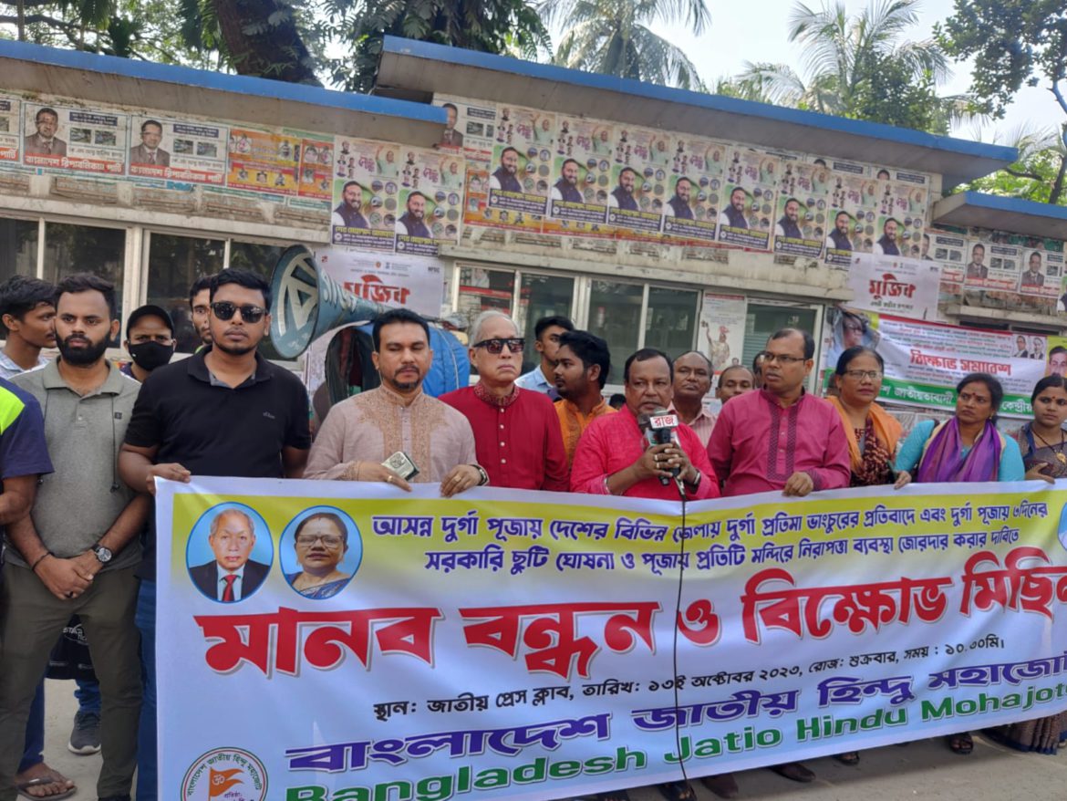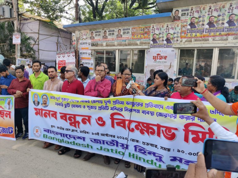 আজ শুক্রবার সকালে রাজধানীর জাতীয় প্রেসক্লাবের সামনে মানববন্ধন ও সমাবেশ করে এসব কথা বলেছেন সংগঠনের নেতারা। দুর্গাপূজাকে কেন্দ্র করে দেশের বিভিন্ন স্থানে হিন্দু নির্যাতন, প্রতিমা ভাঙচুর, পূজায় তিন দিনের সরকারি ছুটি, নিরাপত্তাব্যবস্থা সহ ৪ দফা দাবি করা সহ বিভিন্ন দাবিতে এ কর্মসূচি পালন করা হয়।