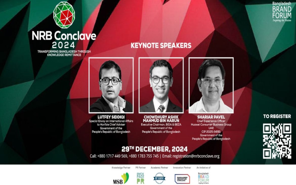 গণপ্রজাতন্ত্রী বাংলাদেশ সরকারের পররাষ্ট্র মন্ত্রণালয়ের সহযোগিতায় বাংলাদেশ ব্র্যান্ড ফোরাম আগামী রবিবার (২৯ ডিসেম্বর ২০২৪) ঢাকার ফরেন সার্ভিস একাডেমিতে এনআরবি কনক্লেভ ২০২৪ শীর্ষক, একটি সম্মেলনের আয়োজন করতে যাচ্ছে।