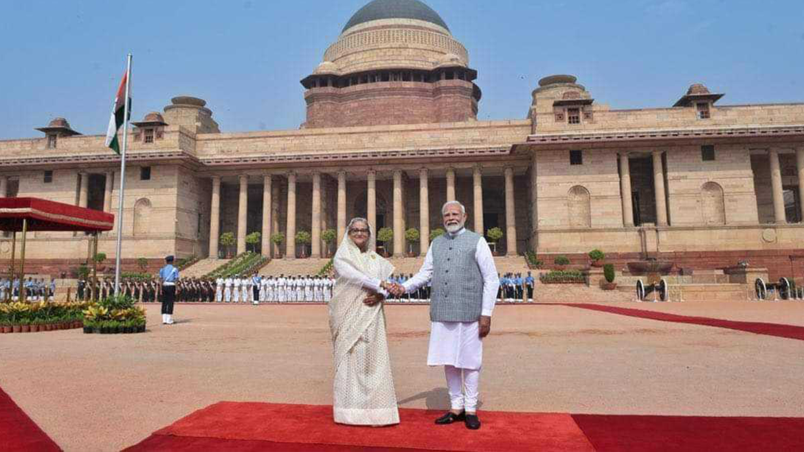 সকালে রাষ্ট্রপতি ভবনে প্রধানমন্ত্রী শেখ হাসিনাকে আনুষ্ঠানিক অভ্যর্থনা জানান ভারতের প্রধানমন্ত্রী নরেন্দ্র মোদি। সেখানে প্রধানমন্ত্রী শেখ হাসিনাকে গার্ড অব অনার দেয় ভারতের সশস্ত্র বাহিনীর একটি চৌকস দল।