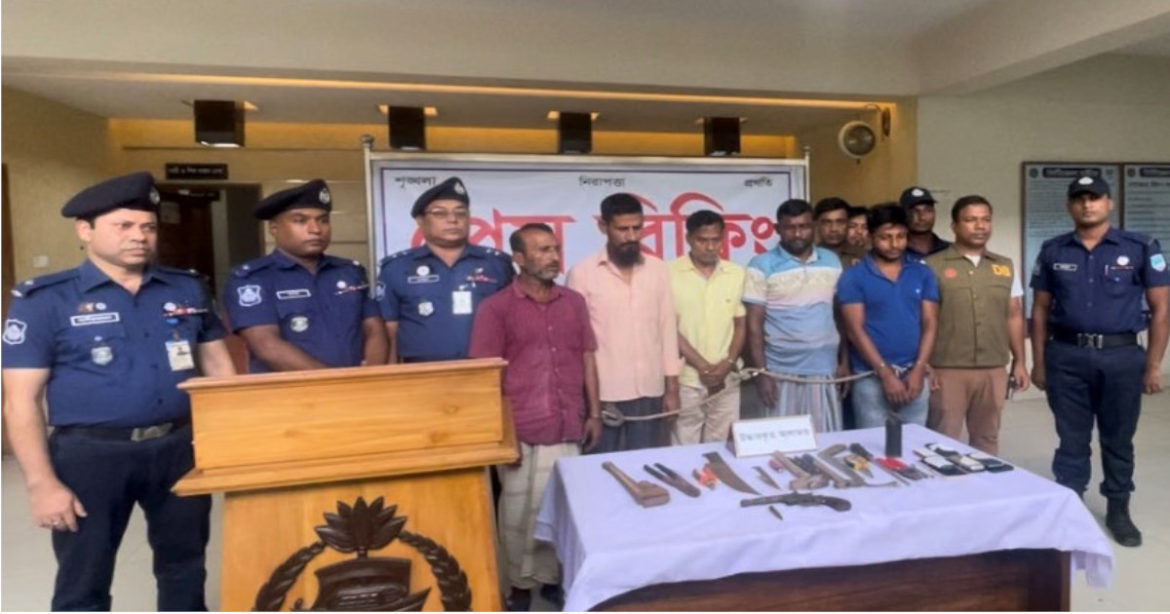 গ্রেফতারকৃতদের কাছ থেকে একটি দেশী লোহার পিস্তল, গুলি, একটি লোহার রড, লোহার চাঁপাতী, লোহার হাতুড়ী, একটি লোহার সেলাই রেঞ্জ, একটি চাকু, একটি প্লাস, হ্যাক্সো ব্লেডের হাতল, একটি গ্যাসের বার্নার, একটি স্কু ড্রাইভার, একটি কাটার, একটি ডাল রেঞ্জ, একটি হাতুরী, একটি প্লাস, ২টি ড্রিল শেড মেশিনের ব্যবহৃত লোহার দন্ড ও একটি লাল রংয়ের মাল্টি চাকু।