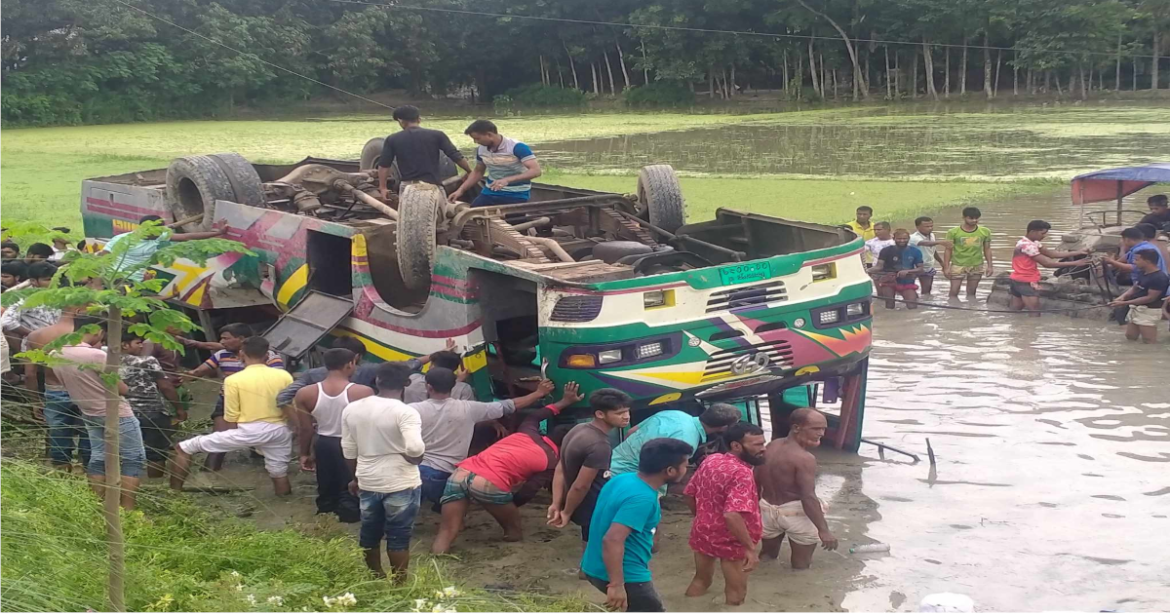 পুলিশ জানায়, ফুলবাড়ী আঞ্চলিক মহাসড়কের পাঁচবাড়ীতে প্রণয় পরিবহনের বাসকে ওভারটেক করার সময় ধাক্কা দেয় মালবাহি ট্রাক। এসময় বাসটি নিয়ন্ত্রন হারিয়ে রাস্তার পাশে খাদে উল্টে বাস চালক নিহত ও কমপক্ষে ১০ যাত্রী আহত হয়েছে।